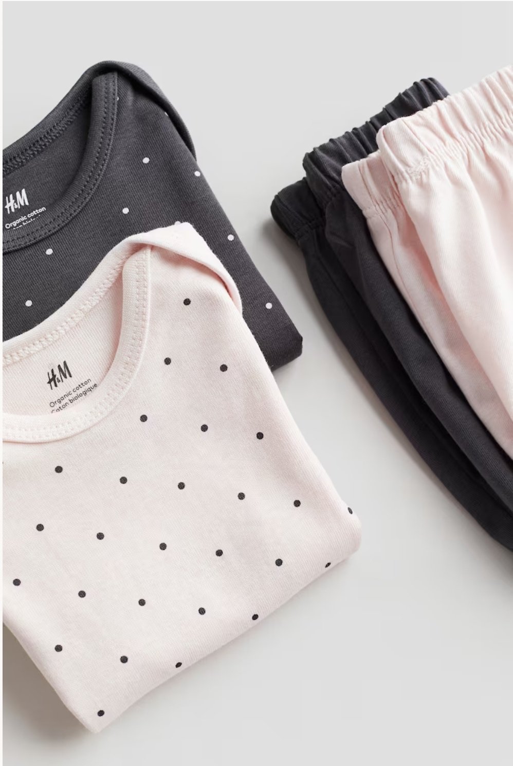 Set with two bodysuits and two pairs of shorts in soft cotton jersey. Short-sleeved bodysuits with an envelope neck for smooth dressing and press-studs at the crotch for easy changing. Shorts with covered elastication at the waist for a comfortable fit around the tummy.