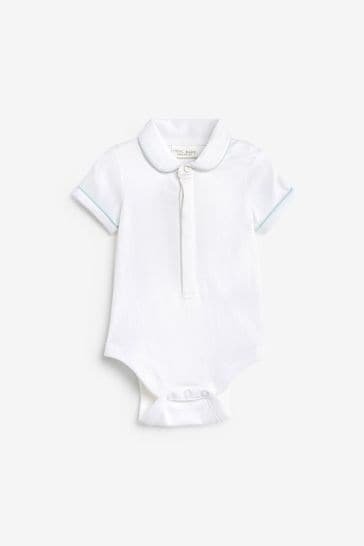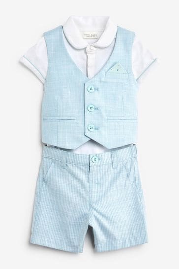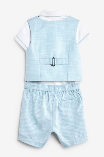 This smart 4 piece set is perfect for any special occasion. Featuring a cotton jersey shirt style bodysuit with tipping detail to collar and cuffs, button placket to the front and between leg popper fastening for easy nappy changes. The set is completed by a waistcoat featuring pocket square, three button fastening and welt pockets, a matching bow tie and pull-on stripe shorts.