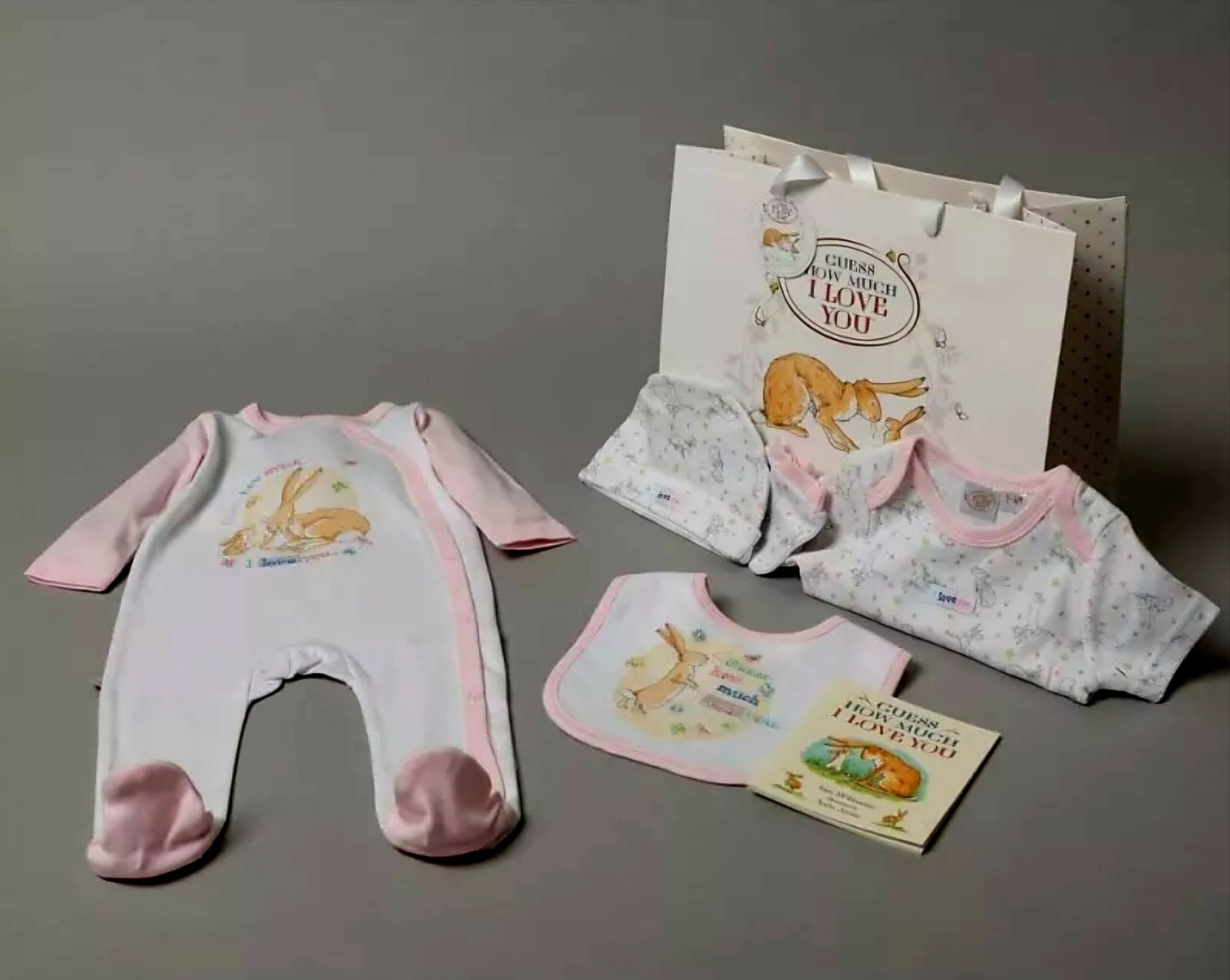Sleepsuit, Bodysuit, Mitts, Hat, Bib. Free book with Gift Bag