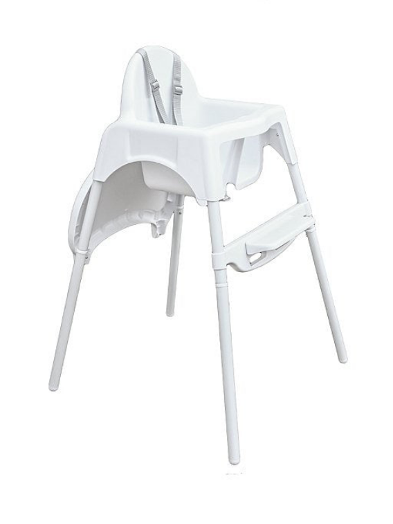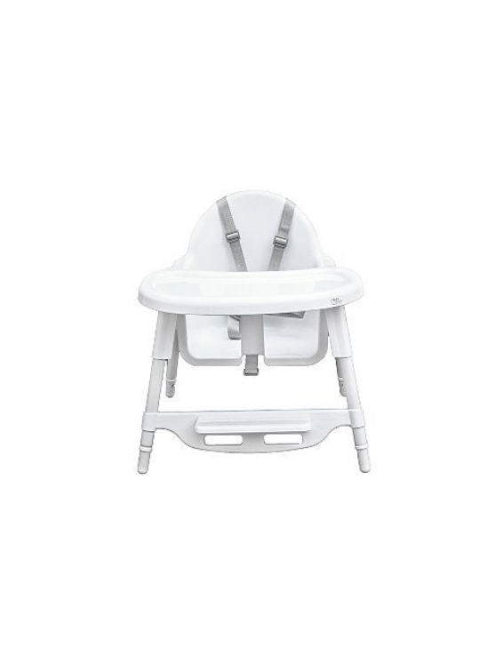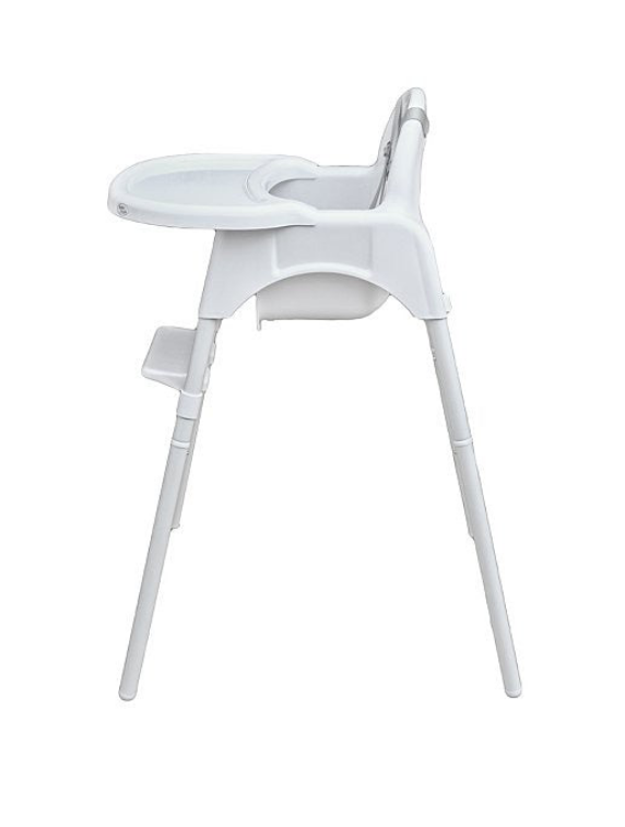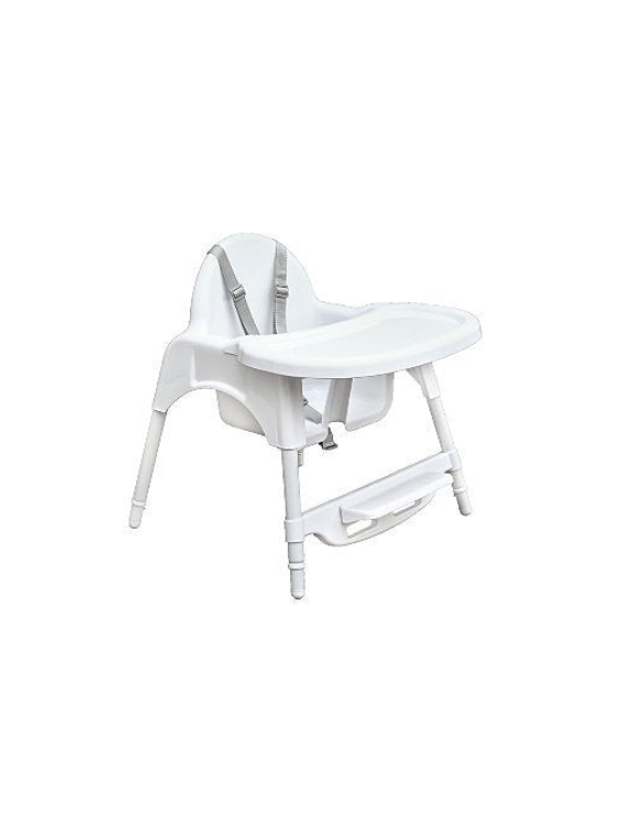This highchair features an all-around plastic seat and 5 point harness ensuring the highest safety. Bottom legs click off and remove the tray to make a junior chair. Simple wipe clean white plastic tray and seat. Easy assemble and dis-assembly for transport.