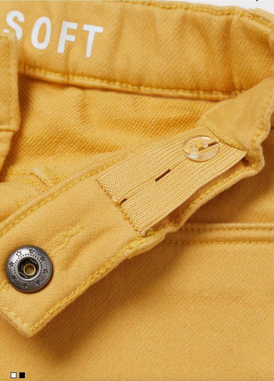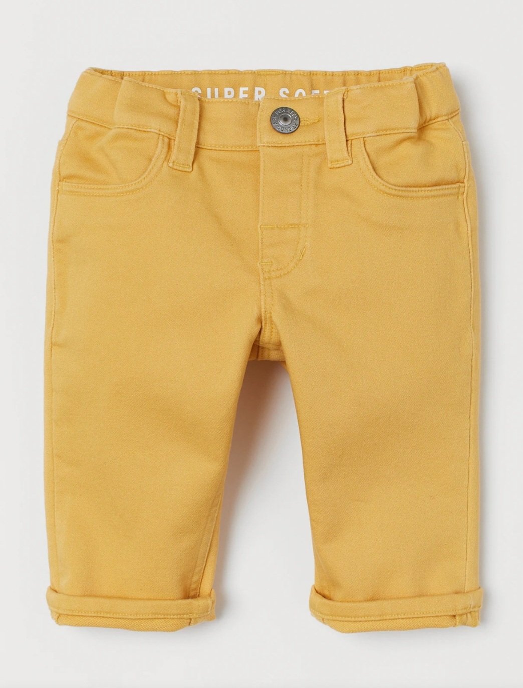 Pants in supersoft stretch cotton twill. Adjustable, elasticized waistband with snap fastener and mock fly. Mock front pockets and regular back pockets.