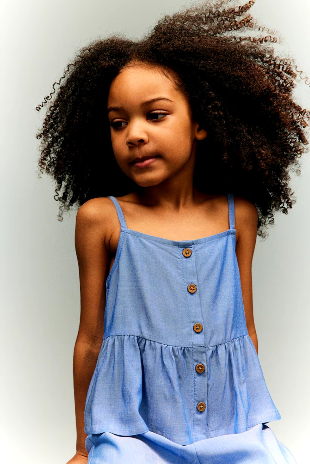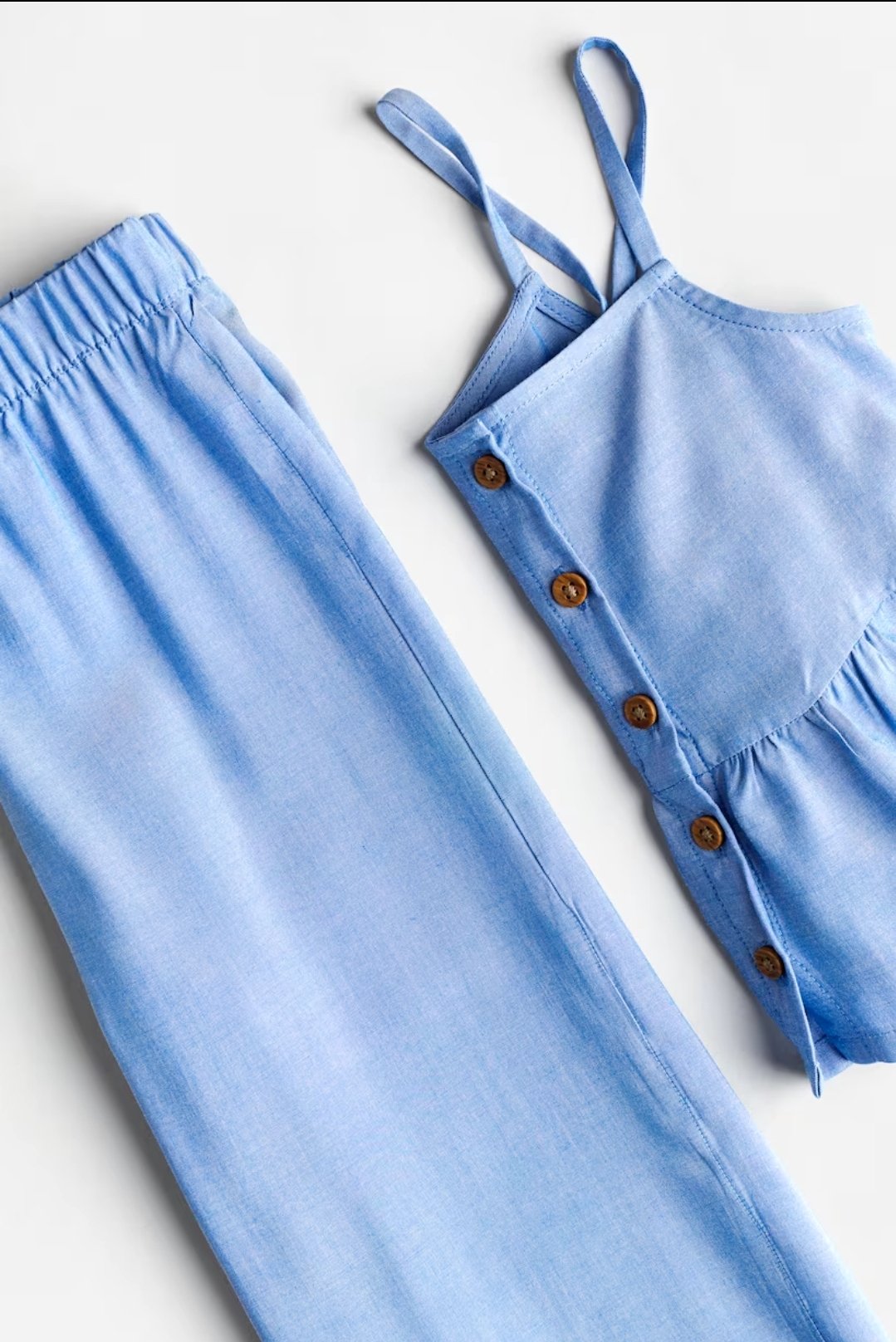 Set with a top and pair of matching trousers in an airy weave. Top with narrow shoulder straps, buttons down the front and a gathered seam with a wide flounce to the hem. Cropped trousers with covered elastication at the waist and wide, straight legs.