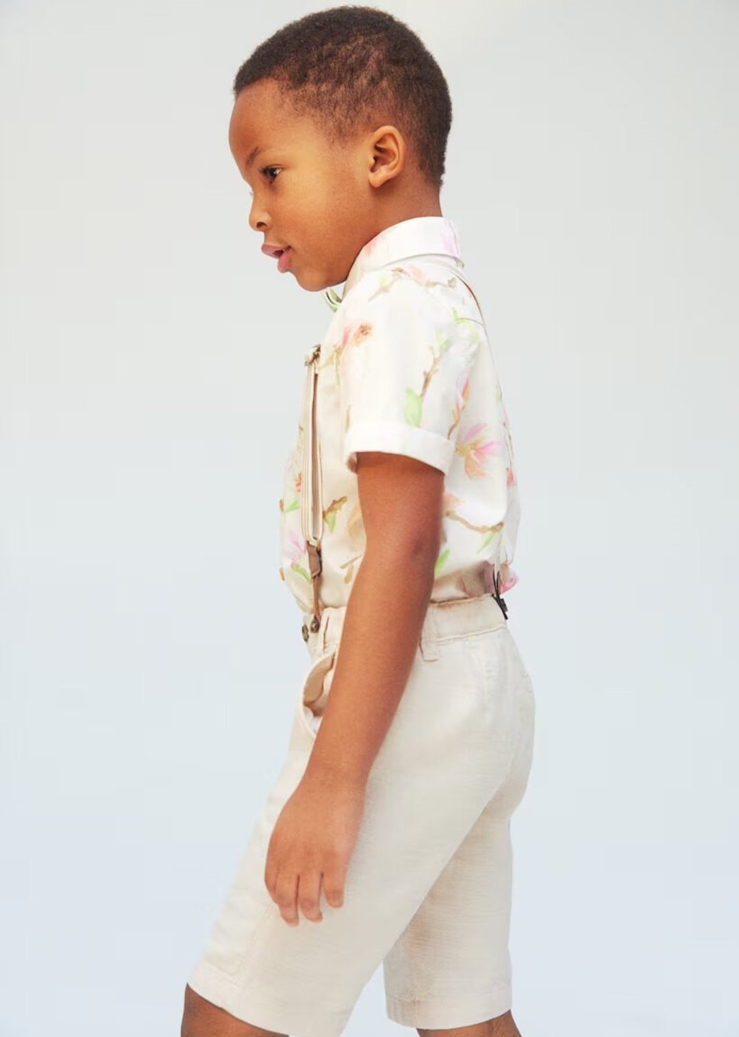 Dressy set with a shirt and pair of shorts in a soft cotton weave. Shirt with a collar, buttons down the front, a yoke at the back and short sleeves with turn-ups.