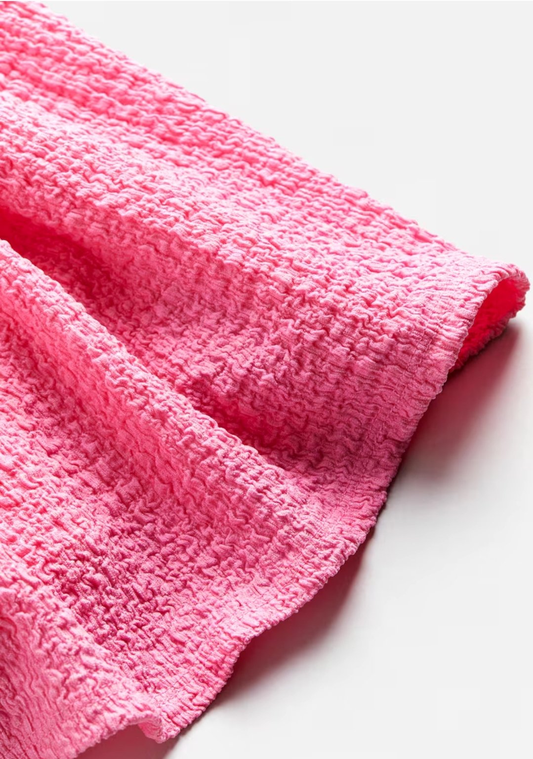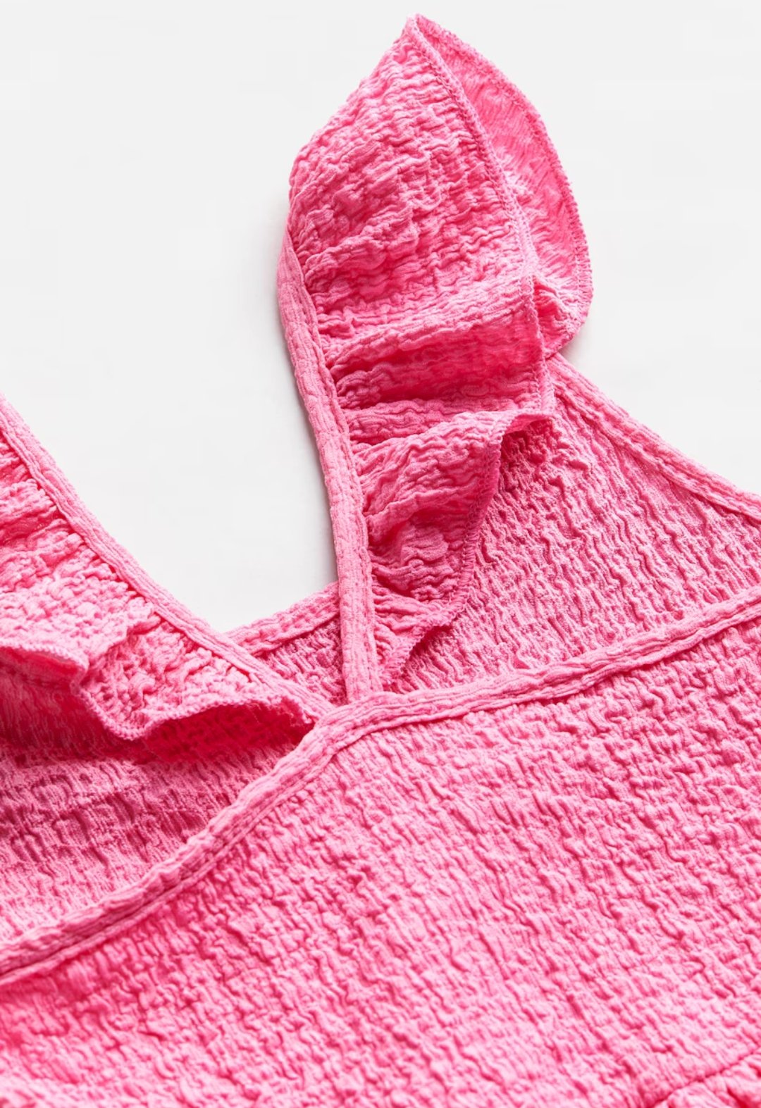 Sleeveless dress in crinkled jersey with a smocked finish. It features flounce-trimmed shoulder straps and a gathered seam at the waist.