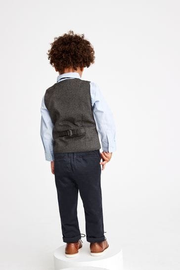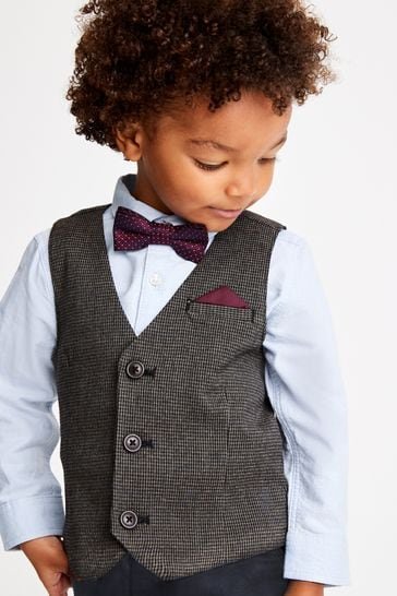 Brown Check Vest, Navy Chinos (Trousers), Light Blue Long-sleeve Shirt, Wine Bow tie