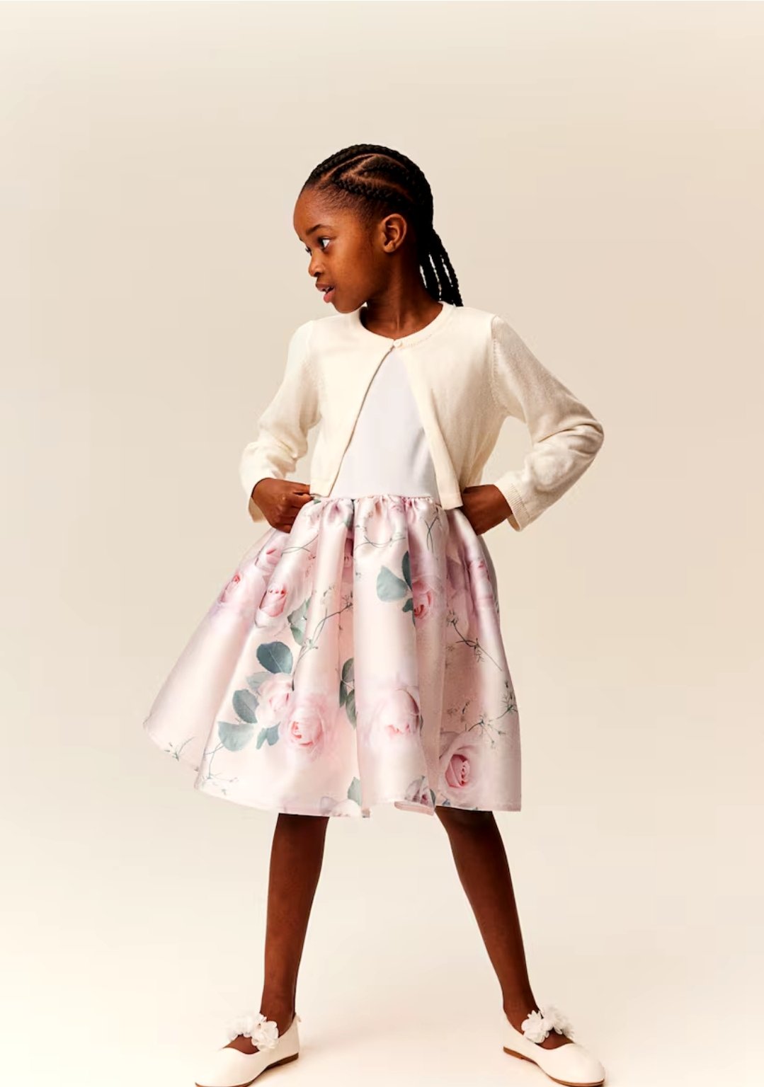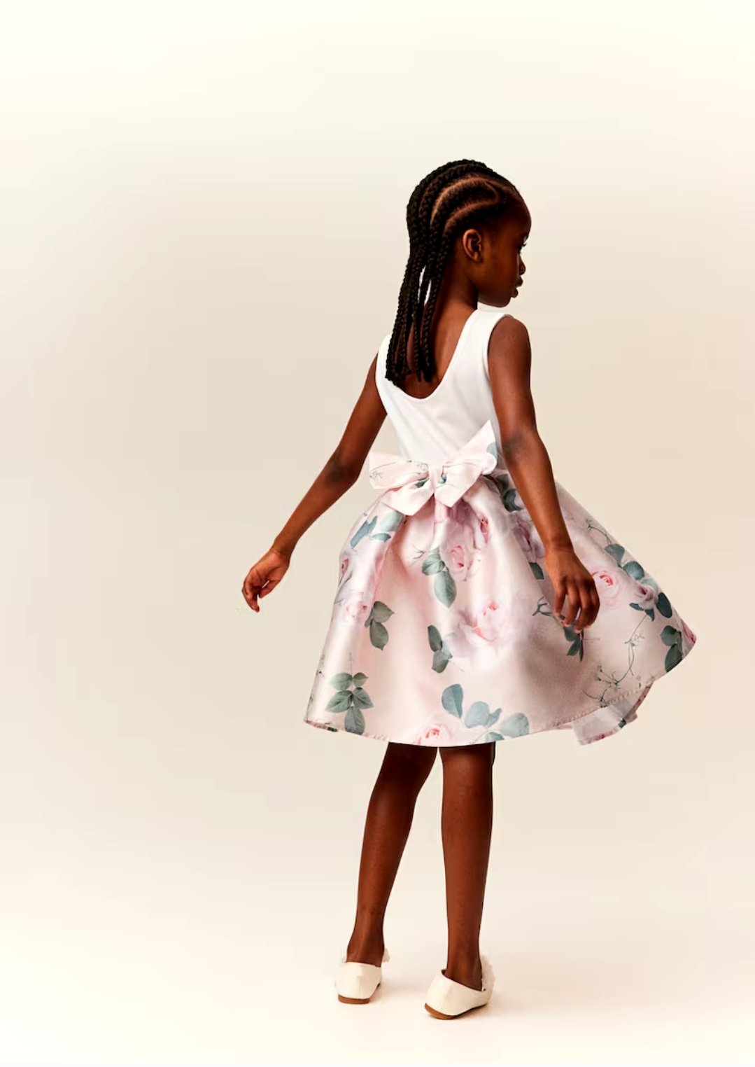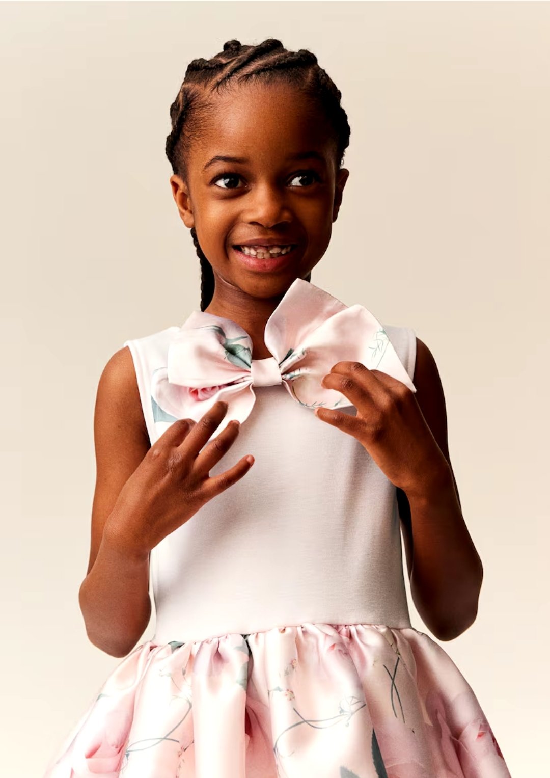 Dress with a soft jersey bodice, a seam at the waist and a decorative bow. Lined, flared skirt in a patterned weave with a sheen.