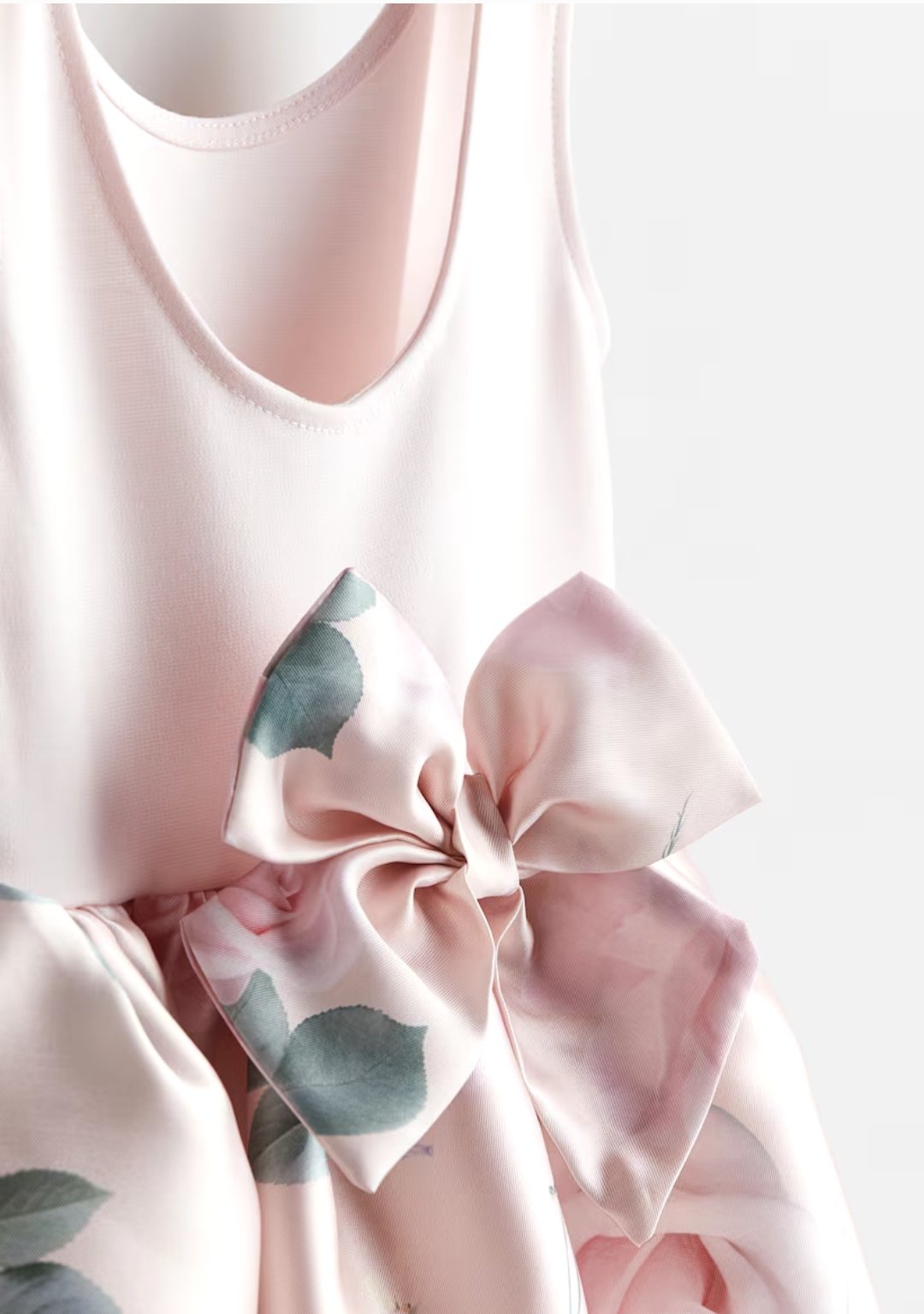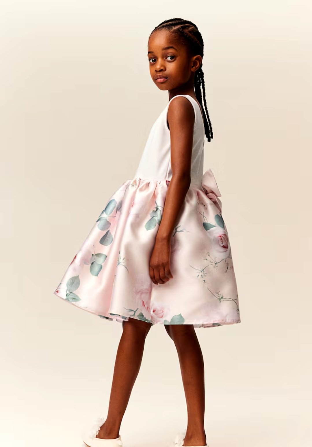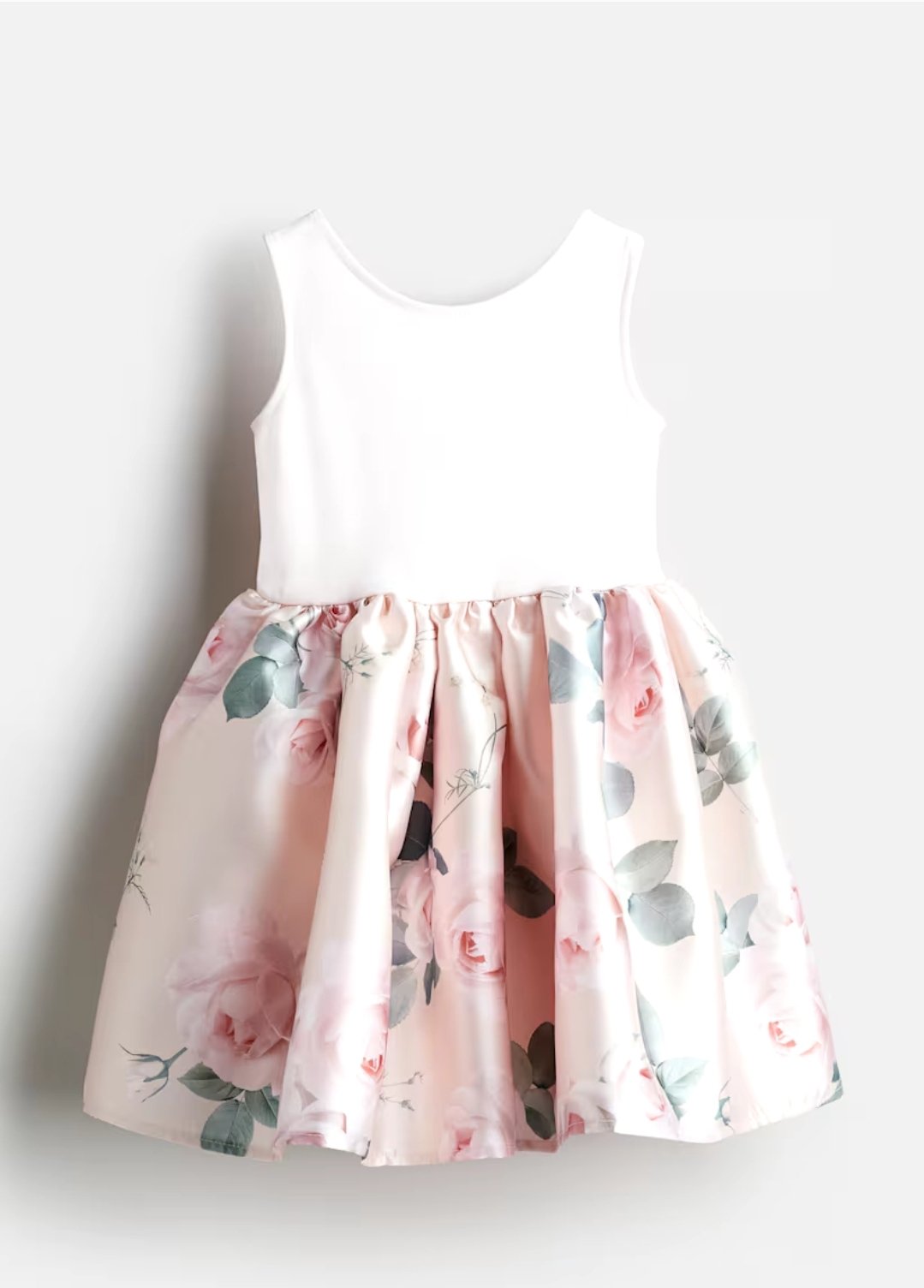 Dress with a soft jersey bodice, a seam at the waist and a decorative bow. Lined, flared skirt in a patterned weave with a sheen.
