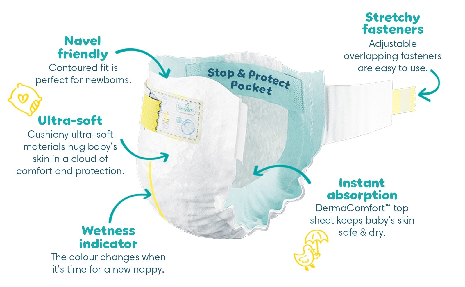 4) Cushiony Ultra Soft materials to hug your baby’s skin in a cloud of comfort & protection. Pampers Premium Protection New baby nappies, the No.1 choice of parents for newborns, are 100% safe for your baby’s skin: they are dermatologically tested and and contain 0% EU perfume allergens (as regulated in the EU Cosmetics Regulation No 1223/2009).