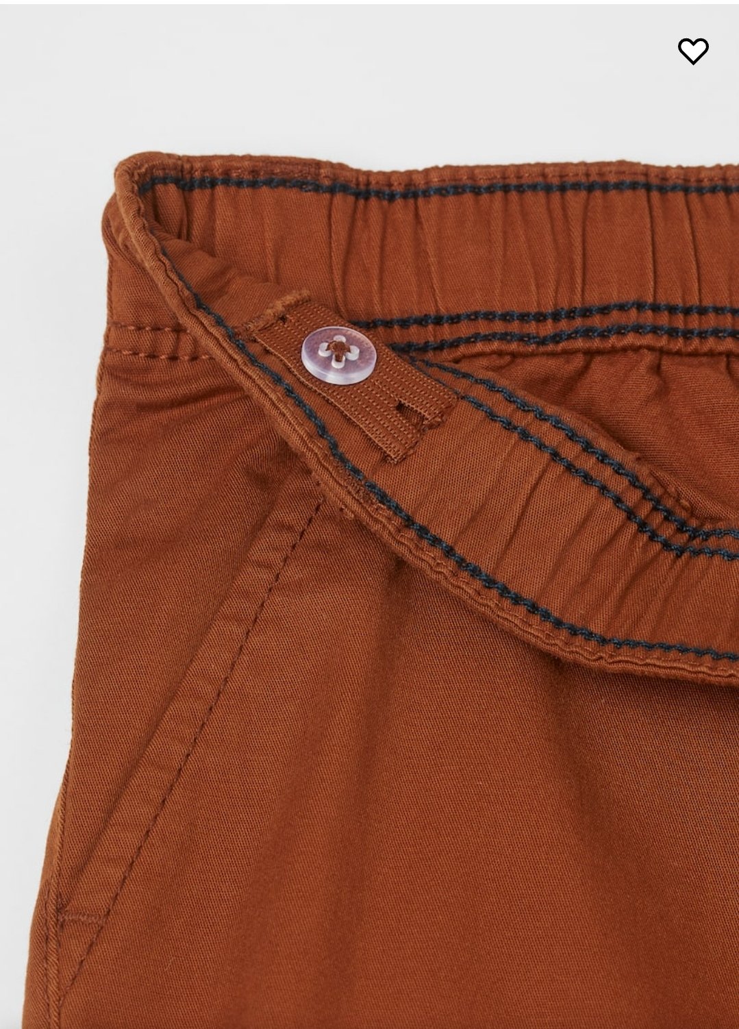 Comfortable, relaxed-fit chinos in cotton twill. Adjustable, elasticized waistband and mock fly with snap fastener. Front pockets, mock back pockets, and tapered legs.