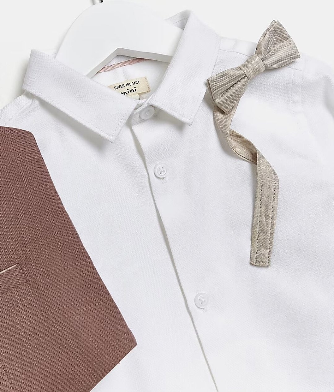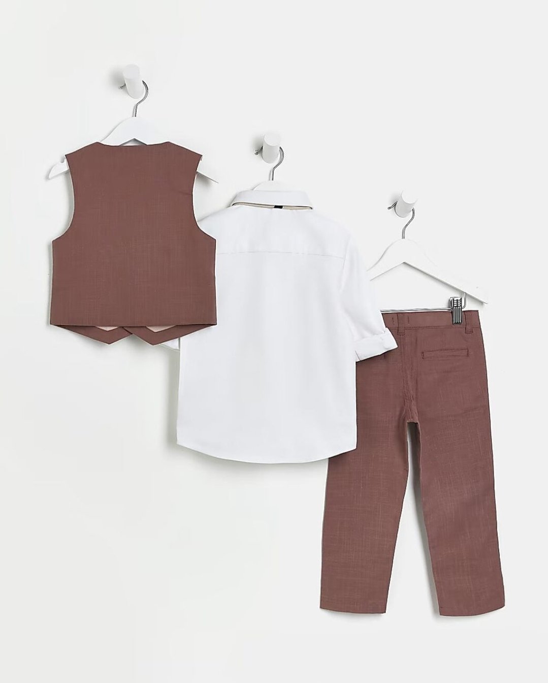 Set includes White Long-sleeved Shirt, Brown Trousers, Brown Vest and Gold Bow Tie