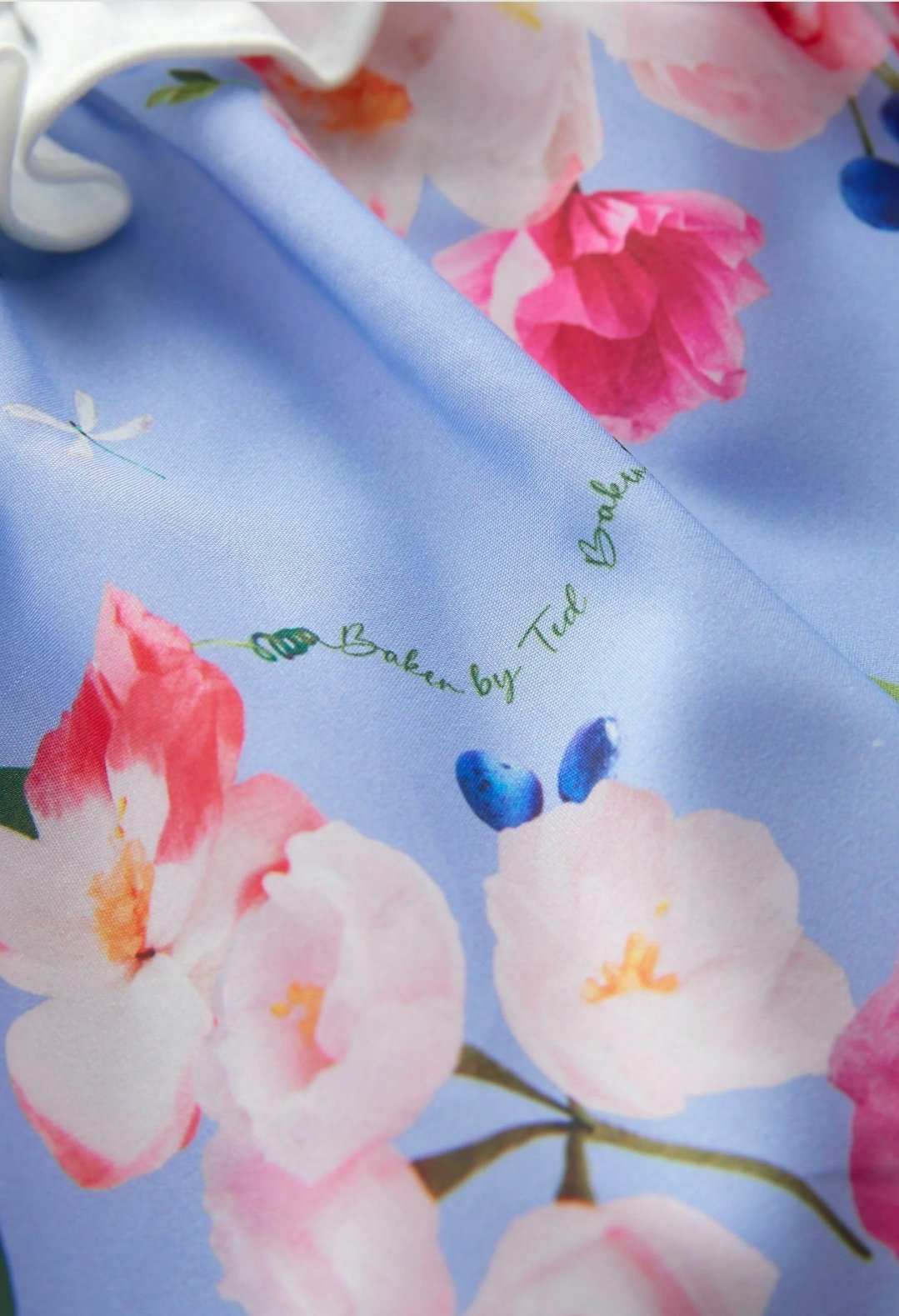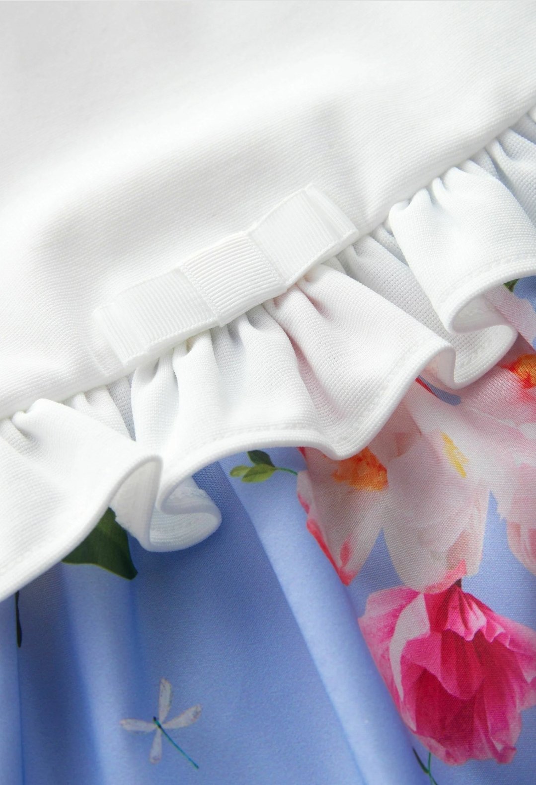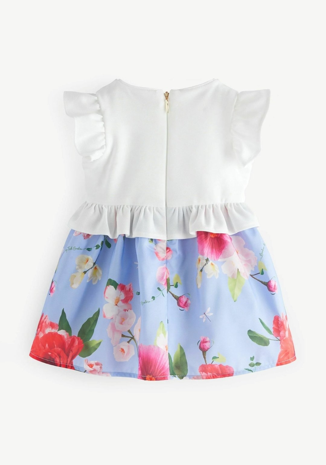 Dress her up in style with this adorable dress from Baker by Ted Baker. The pretty mockable design boasts a classic white short sleeve bodice with frilled sleeves and a peplum ruffle detail on the waist and it is complemented with a full skirt that is finished in a striking floral print on a blue base. Team this dress with some cute sandals to complete the look.