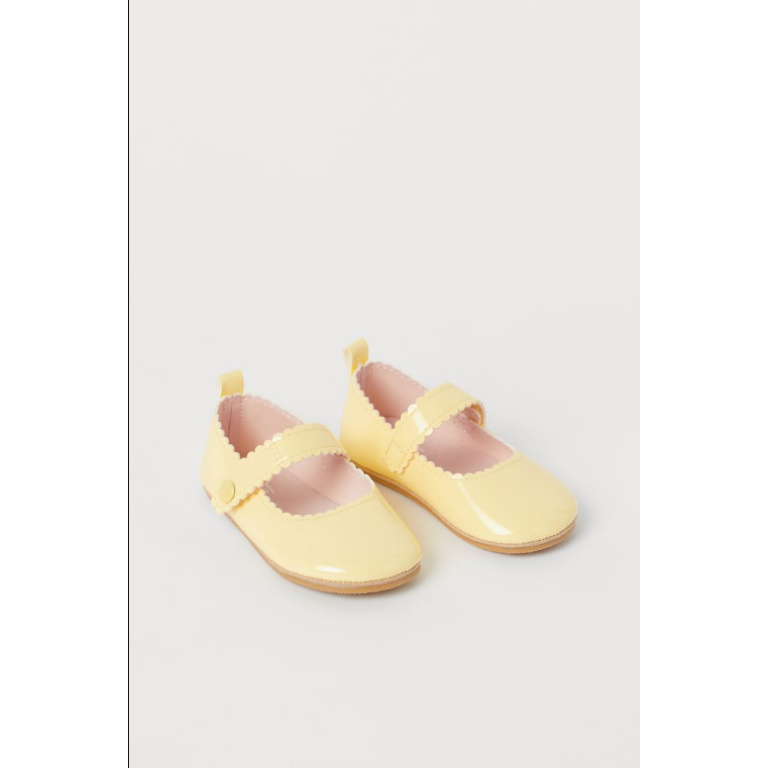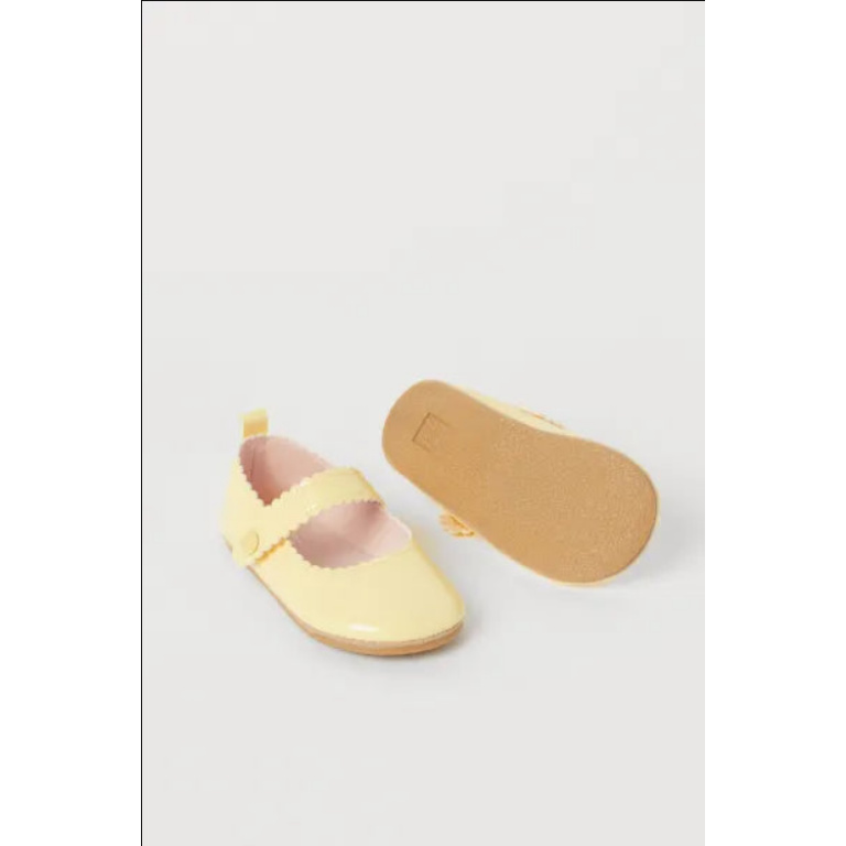 Ballet pumps in imitation patent leather with scalloped edges and a loop at the back. Hook and loop tab over the foot with a decorative button in the same colour. Patterned soles. Height of soles 0.3 cm.